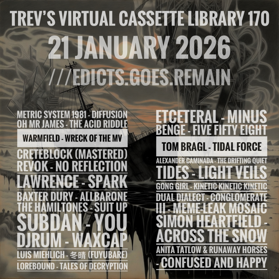 Taking us back down now, to a much darker place is Warmfield – Wreck of the MV Creteblock – Resonances from the Depths – Which is my own compilation album released on the Trevlad Bandcamp page. Pick it up for a buck. It’s got 24 Stellar artists. And a reminder to get your entries in for the next compilation dropping at the end of March.