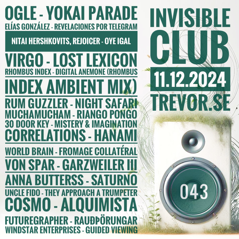 This entry was posted on December 11, 2024 by trevlad. It was filed under Mix shows, Music and was tagged with 30 Door Key, alternative, Altin Village & Mine, ambient, ambient electronic, Anna Butterss, avant-garde, Avocaudio, Barcelona, Berlin, Binaural Space, Brighton, Brooklyn, bucle, California, Chicago, chill, chill-out, Cologne, Correlations, COSMO, Daventry, dub, dubstep, Elías González, electro, electronic, electronic music, electronica, exotica, experimental, experimental electronic, funk, Futuregrapher, Germany, Halifax, hauntology, house, Iceland, Illinois, improvisational music, indie, indie instrumental, indie pop, instrumental, Intellitronic Bubble, International Anthem, Israel, Italy, Japan, jazz, Jesse Harris, jungle, krautrock, Leipzig, library music, London, Los Angeles, Mansions and Millions, minimal synth, MuchaMuchaM, New York, Nitai Hershkovits, Ogle, Poland, pop, Preston Capes, psychedelic, Radio Ambulante, Rejoicer, Rhombus Index, Rhythm Section International, Rome, rootstep, Rum Guzzler, Secret Sun, See Blue Audio, soul, soundscape, Spain, synth, synth pop, synthesizer, synthwave, Tel Aviv, UK, Uncle Fido, vaporwave, Virgo, Von Spar, Windstar Enterprises, world, World Brain.