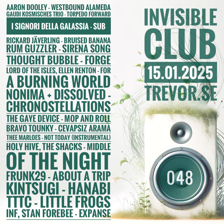 This entry was posted on January 15, 2025 by trevlad. It was filed under Mix shows, Music and was tagged with Aaron Dooley, ABrecords, AD 93, alternative, ambient, atmospheric, Avocaudio, Biel/Bienne, Big Crown Records, Bravo Tounky, Brooklyn, Bulgaria, California, Centripetal Force, Colorado, Coralville, cosmic disco, Curious Music, dark ambient, deep house, Denver, drone, dub, dubstep, electro, electronic, electronica, Ellen Renton, experimental, field recordings, folk, France, Fruit Exports, Frunk29, funk, Gaudi Kosmisches Trio, Gothenburg, Höga Nord Rekords, Holy Hive, house, I Signori Della Galassia, idm, Indonesia, Inf, Ingrown Records, instrumental, Iowa, jazz, jungle, kintsugi, kosmische, La Selva Beach, Leeds, leftfield, London, Lord Of The Isles, Los Angeles, Mahorka, Medical Records, Moolakii Club Audio Interface, Moscow, new age, new wave, New York, Nonima + Dissolved, North Carolina, Not Not Fun Records, Oakland, psych, psychedelic, psychedelic soul, Rickard Jäverling, rootstep, Rum Guzzler, Russia, Saint Germain Laval, Scotland, Seattle, soul, soundtrack, spiritual, Stan Forebee, Surabaya, Sweden, Switzerland, synthesizer, techno, The Gaye Device, The Shacks, Thee Marloes, Thought Bubble, tttc, UK, Washington, Wirral, world music.