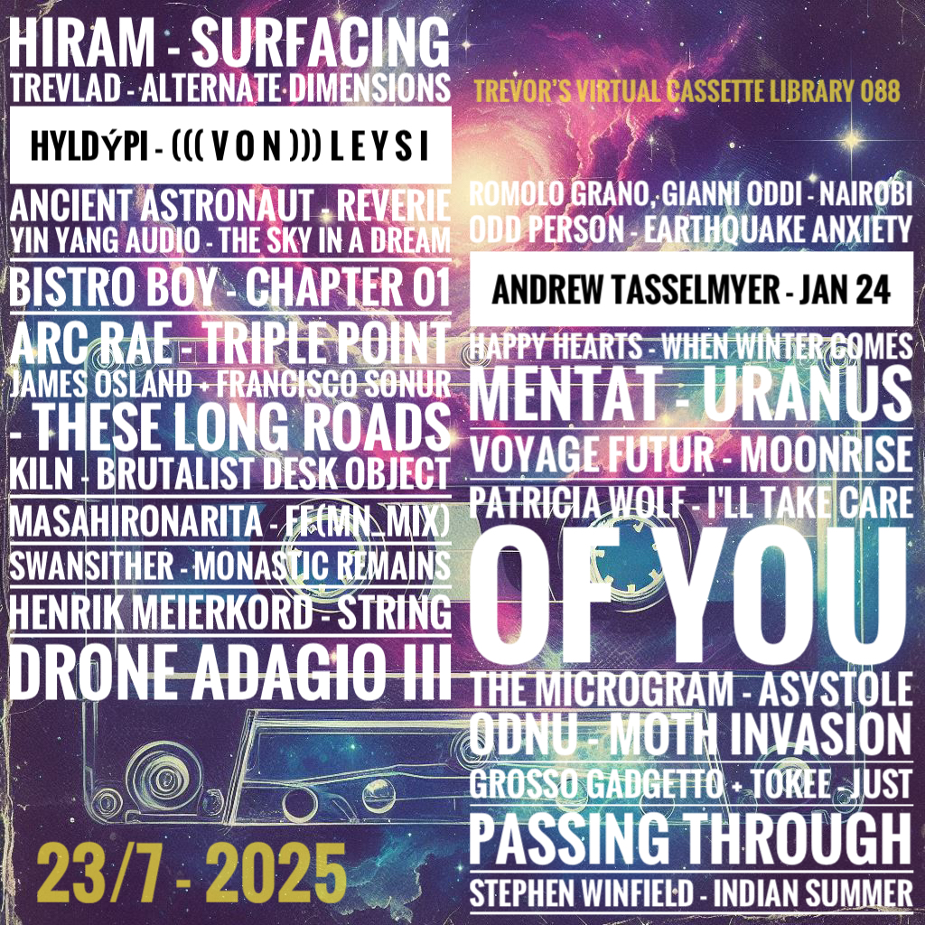 Trevor here—tuning the dial back to presence and possibility. You’ve landed once again on a 90-minute ambient expedition through the ephemeral ether. This is Trevor’s Virtual Cassette Library 088, your magnetic doorway to sonic immersion, with a metaphysical flip at the midpoint. Perfect for your twilight walks, intentional solitude, or just drifting between seconds.