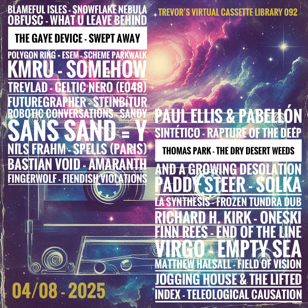 Trevor here, transmitting from home base Sollentuna, Sweden. This is your gateway to another immersive expedition through sound—Trevor’s Virtual Cassette Library 092 A 90-minute journey with a metaphysical flip at the halfway mark—perfect for a long walk, a mental wander, or a quiet moment alone with the universe. Today’s flight is sponsored by the labels that keep our circuits humming: Mahorka, Dustopian Frequencies, and, Cyclical Dreams.