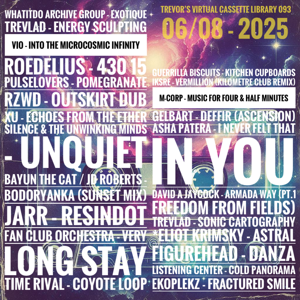 Trevor here, transmitting from home base Sollentuna, Sweden. This is your gateway to another immersive expedition through sound—Trevor’s Virtual Cassette Library 093 A 90-minute journey with a metaphysical flip at the halfway mark—perfect for a long walk, a mental wander, or a quiet moment alone with the universe. Today’s flight is sponsored by the labels that keep our circuits humming: Moniker Eggplant, Mystery Circles, whitelabrecs, Moolakii Club Audio Interface, Imaginary North, Subexotic Records, Moon Glyph, Castles In Space.