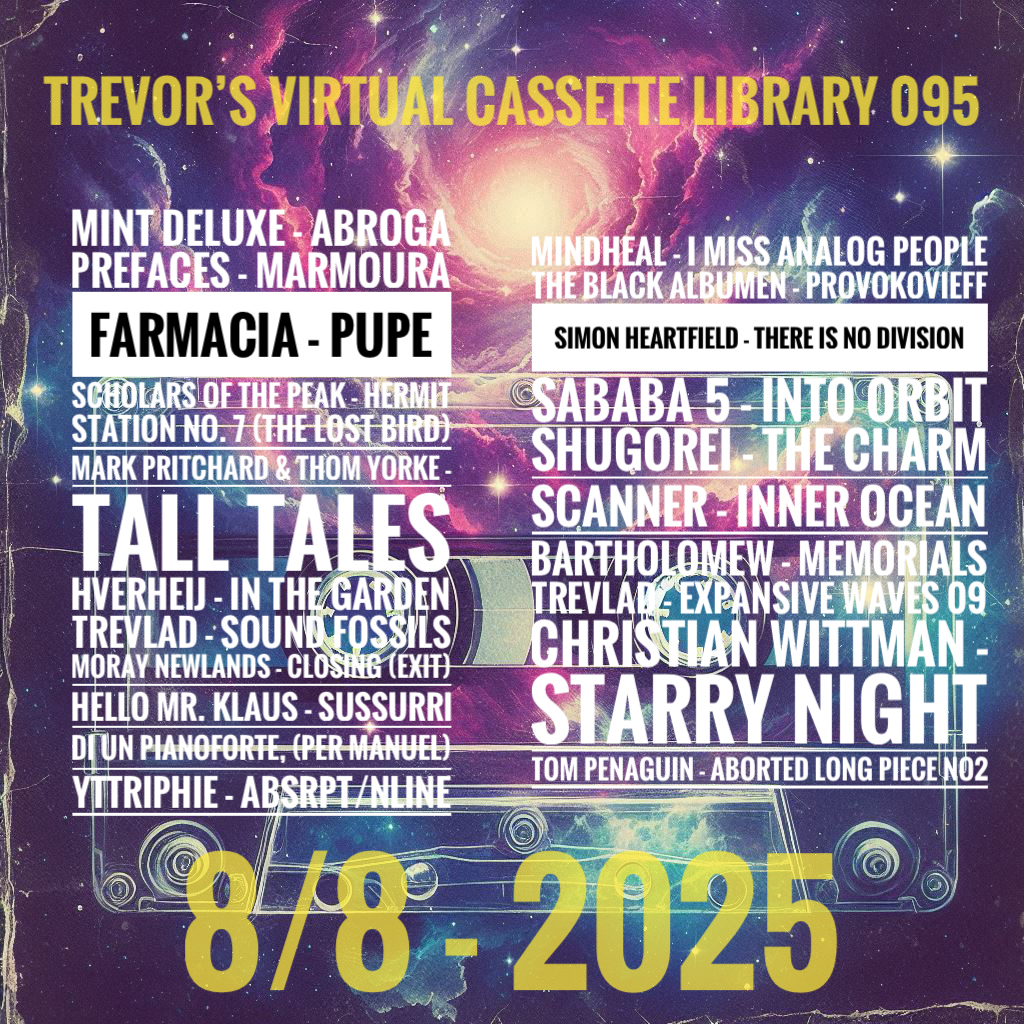 Trevor here, transmitting from home base Sollentuna, Sweden. This is your gateway to another immersive expedition through sound—Trevor’s Virtual Cassette Library 095 A 90-minute journey with a metaphysical flip at the halfway mark—perfect for a long walk, a mental wander, or a quiet moment alone with the universe. Today’s flight is sponsored by the labels that keep our circuits humming: Hisstology sister label of Ruptured Records, Preston Capes sister label of Woodford Halse, Cyclical Dreams, Projekt Records, Buried Treasure, Machine Records, Batov Records, Lunar Module sister label of Castles In Space,