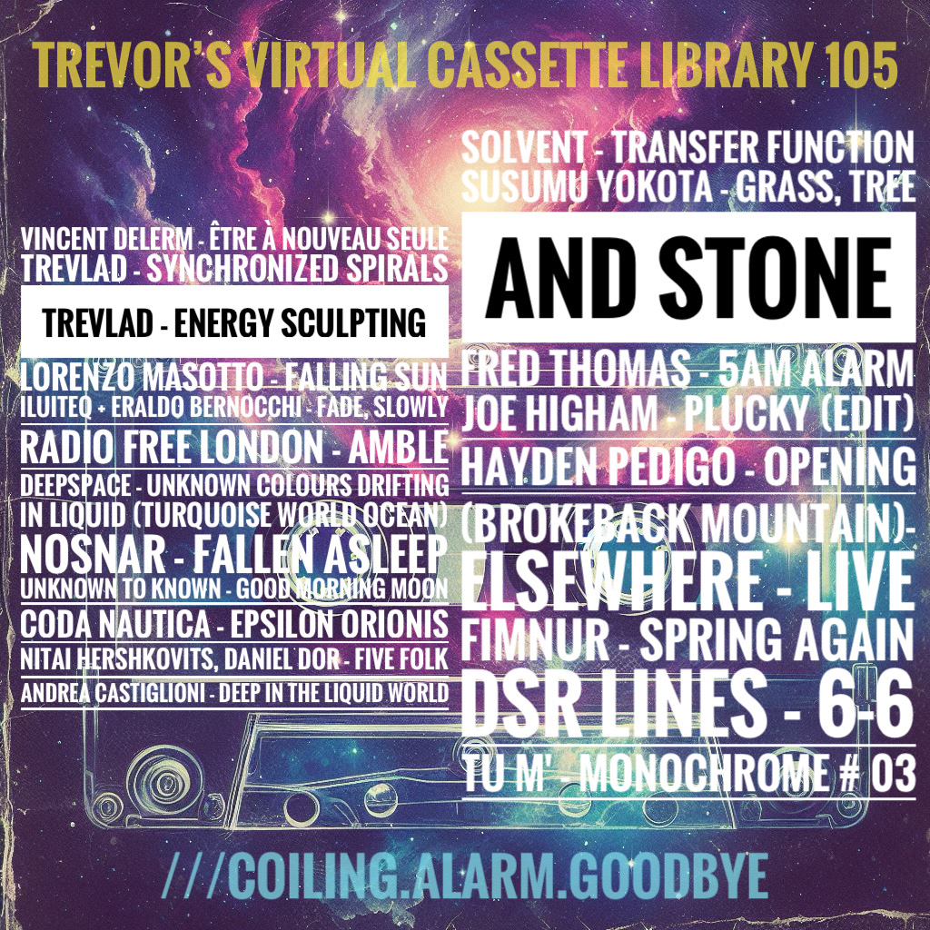 Welcome to Trevor’s Virtual Cassette Library episode 105 A 90-minute musical journey. This episode is a deep dive into the magnetic hiss of memory, the shimmer of modular synths, and the emotional resonance of modern composition. woven together into two, uninterrupted, 45 minute adventures. There is a metaphysical flip at the halfway mark. A lovingly warped mixtape of ambient meditations, experimental electronics, and genre-fluid explorations. The shows are designed for a long walk, a mental wander, or a quiet moment alone with the universe.