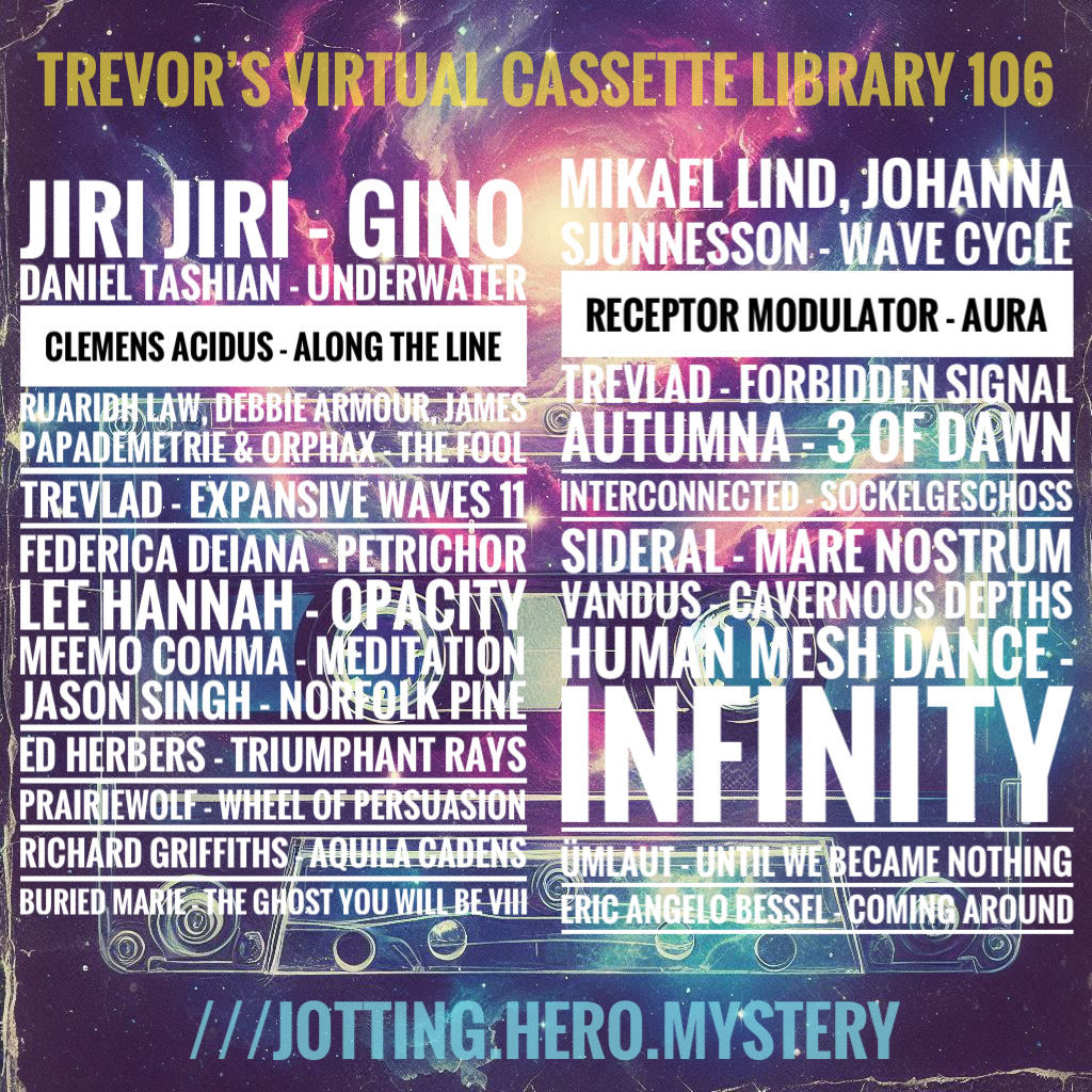 Welcome to Trevor’s Virtual Cassette Library episode 106 Jotting Hero Mystery. Which is not only the soundtrack in the background but a geographical location according to What3words with its own video. Pre order the album on Bandcamp to support the channel, it gets released when it reaches the Mixcloud subscriber count which is currently 16. Of course if you do subscribe there’ll not only be an extra track but you’ll also get all my albums for the monthly subscription price of 3 dollars. These episodes are 90-minute musical journeys. This episode is a spectral drift through modular hauntology, Sardinian piano reveries, and aquatic synth rituals. woven together into two, uninterrupted, 45 minute virtual cassette sides, with a metaphysical flip halfway through. A lovingly warped mixtape for dusk listeners, headphone wanderers, and those who find comfort in the crackle of forgotten formats. The shows are designed for a walk, a mental wander, or a quiet moment alone with the universe.