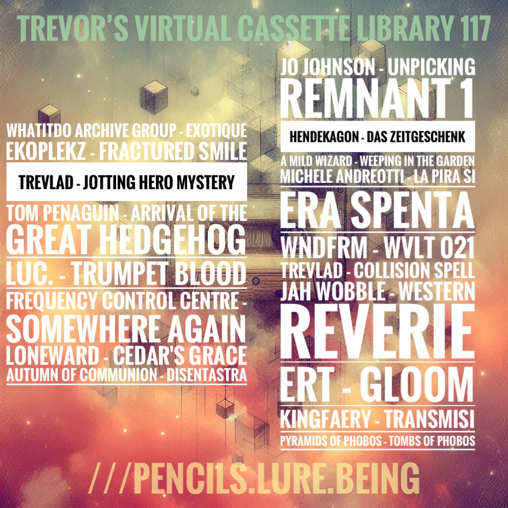 Welcome, wanderers of waveform and seekers of sonic sanctuary. You’ve tuned into Trevor’s Virtual Cassette Library, Episode 117—titled Pencils Lure Being, a phrase etched in the coordinates of the cosmos and mapped via What3Words to the visual portal on YouTube. It’s also the soundscape you hear in the background and is available for pre-order on Bandcamp. —The album drops once it reaches 17 tracks.
