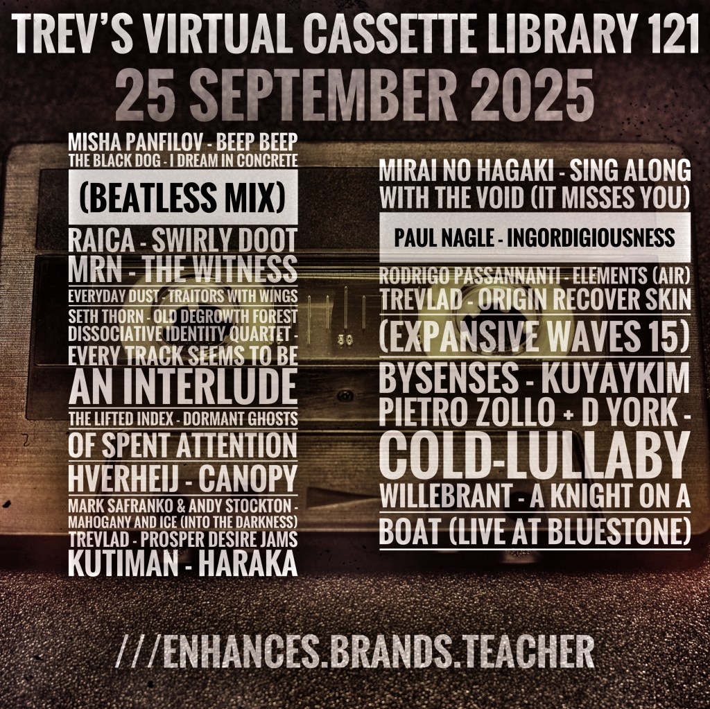 Welcome, sonic wanderers. You’ve tuned into Trev’s Virtual Cassette Library, Episode 121—Enhances Brands Teacher. A name, a signal, and a location. Drop it into What3Words and you’ll find the coordinates of this episode’s visual transmission. The name is also the title of the track you hear in the background, and is available for pre-order on Bandcamp and can also be absorbed on Youtube.
