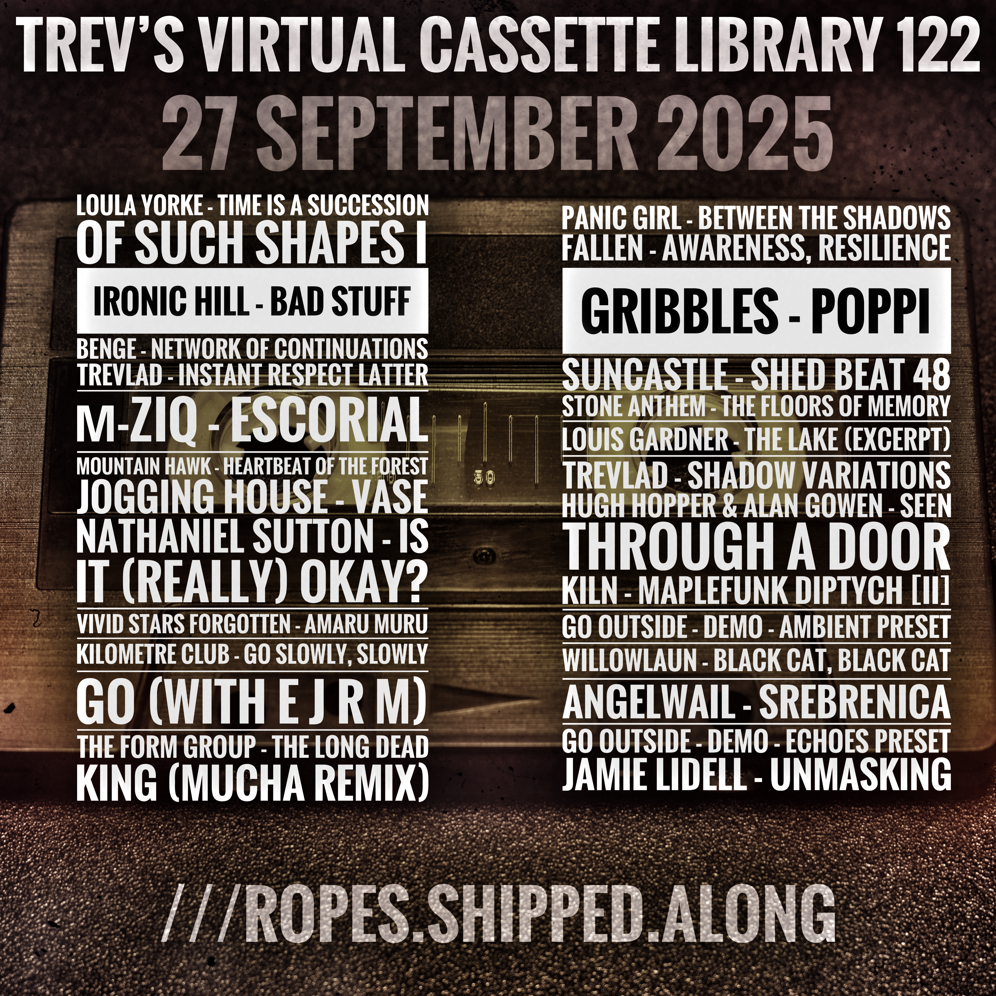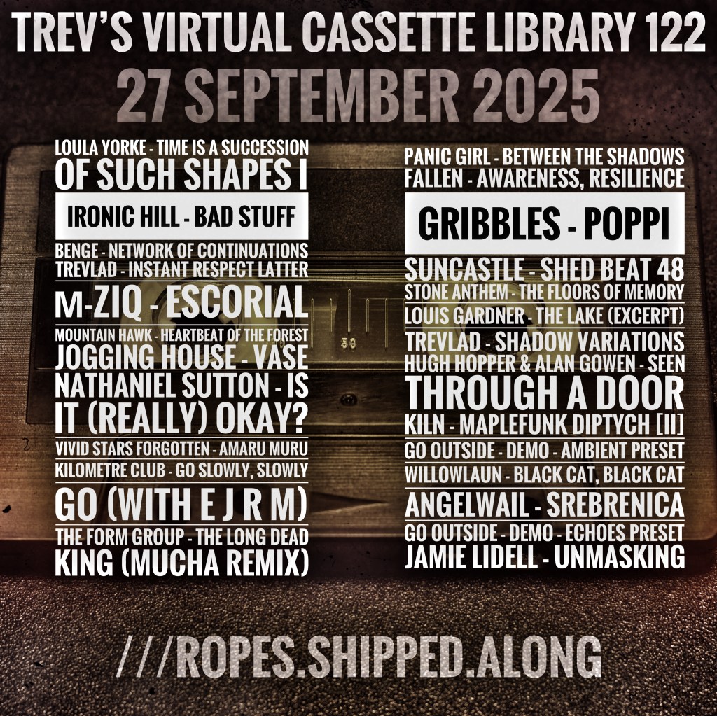 This entry was posted on September 27, 2025 by trevlad. It was filed under Mix shows, Music, Music podcast and was tagged with A Strangely Isolated Place, Adventurous Music, Alan Gowen, Alberta, algorithmic composition, alternative, ambient, ambient electronic, ambient music, Angelwail, art rock, atmospheric ambient, µ-Ziq, Balmat, Barcelona, beats downtempo, Benge, Bosnia and Herzegovina, braindance, breakbeat, canterbury, Castles In Space, chill, collage music, Coventry, Cuneiform Records, D.C., dance, dark ambient, decent sampler, deep listening, depressive ambient, DiN, diy, downtempo, drone, drone ambient, E J R M, EC Underground, Edmonton, electro-acoustic, electroacoustic, electroacoustic improvisation, electronic, electronic music, electronica, em, emoambient, EQ Ambient sublabel, experimental, experimental down-tempo, Fallen, field recording, field recordings, Florida, Frankfurt Am Main, Germany, Go Outside, gribbles, harmonium, hauntology, headphone music, headphone sound, Hove, Hugh Hopper, idm, Illinois, Imaginary North, indie, instrumental, Ironic Hill, Italy, Jamie Lidell, Japan, jazz, Jogging House, KILN, Kilometre Club, lo-fi, lofi, London, Louis Gardner, Loula Yorke, lowercase, Mücha, meditation, Mike Paradinas, modern classical, modular synth, modular synthesis, modular synthesizer, Mountain Hawk, musique concrete, Muzan Editions, Nashville, Nathaniel Sutton, nature, Neotantra, new age, new wave, New York, Nottingham, Objects Forever, Ontario, organic electronic, Osaka, Panic Girl, post-rock, progressive rock, rephlex, Richmond, rock in opposition, rohs! records, sample instrument, Sardinia, shoegaze, Sollentuna, sound collage, soundscapes, Spain, Stone Anthem, Suncastle, Sunderland, Sweden, synth pop, synthwave, techno, Tennessee, The Form Group, The Leaf Library, Todo, Toronto, trance, trevlad, Triplicate Records, Truxalis, UK, Vermont, Virginia, Vivid Stars Forgotten, Washington, willowlaun.