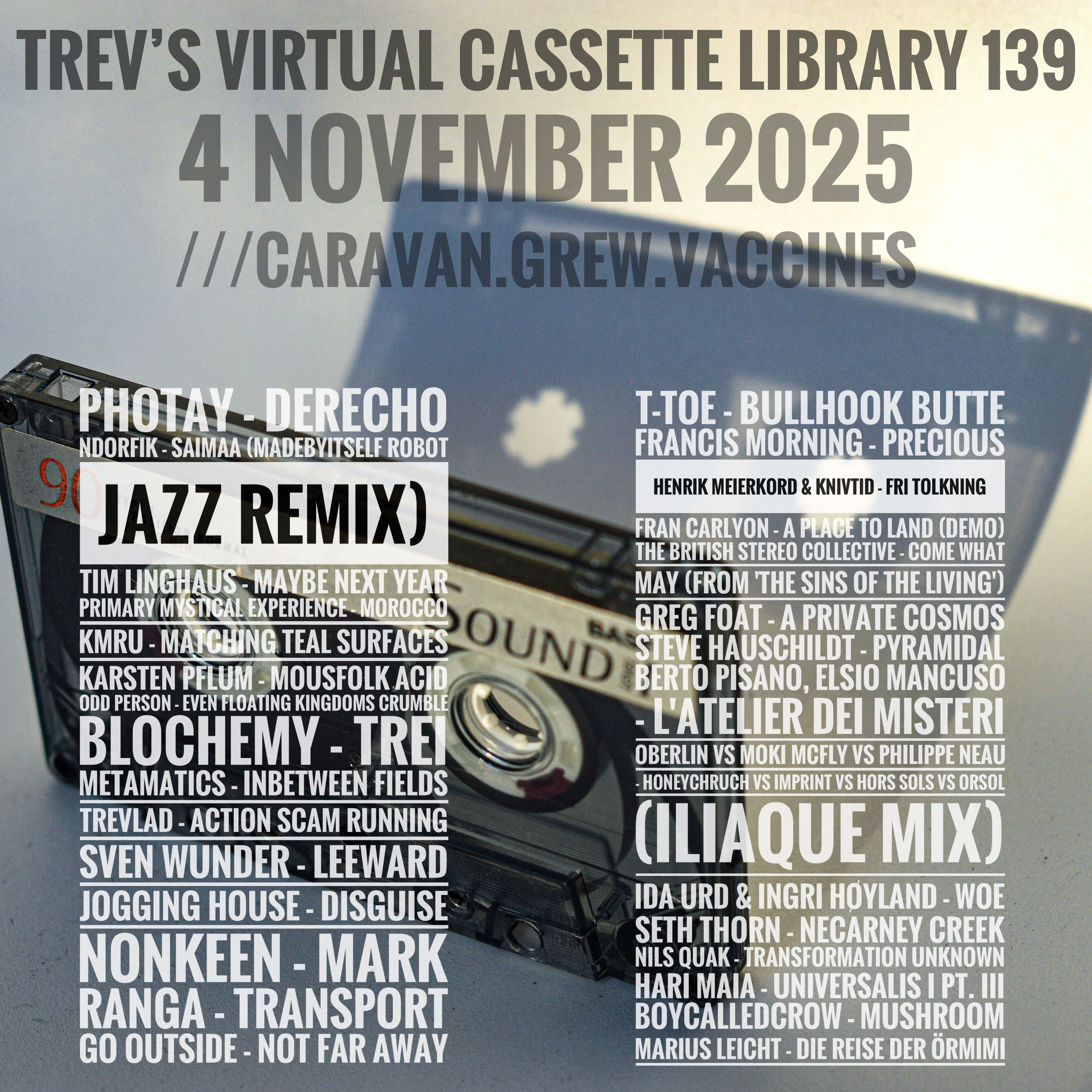 This entry was posted on November 4, 2025 by trevlad. It was filed under Mix shows, Music, Music podcast and was tagged with acid, acoustic, alternative, alternative rock, ambient, Ameritz Music, analog, Argentina, Arizona, Audiobulb, Balmat, Barcelona, bass music, beat tape, beats, Berlin, berlin school, Berto Pisano, blochemy, boycalledcrow, Brazil, breaks, Brooklyn, Buenos Aires, Bulgaria, California, Castles In Space, charity album, Chester, chill, Colorado, Colorado Springs, compilation, Copenhagen, crime, Cyclical Dreams, dark ambient, deep techno, Denmark, diy music, down tempo, downtempo, Driftworks, drone, dub, electro, electronic, electronica, Elsio Mancuso, England, erotic, esoteric, experimental, field recordings, folk, folktronica, Four Flies Records, Fran Carlyon, France, Francis Morning, Frankfurt Am Main, funk, future beats, Georgia, Germany, giallo music, Go Outside, Greg Foat, groove, halfstep, Hari Maia, hauntology, Henrik Meierkord, hip hop instrumentals, home-recording, hypnotic techno, Ida Urd, idm, Iliaque, indie, indie electronic, Ingri Høyland, Ingrown Records, instrumental, Italy, jazz, jazz-funk, jazz-rock, Jogging House, Karsten Pflum, Kenya, KMRU, Knivtid, Koblenz, krautrock, Las Vegas, LEITER, Lo Recordings, lo-fi, Local Gods, lofi, London, Los Angeles, madebyitself, Mahorka, Marius Leicht, meditation, melodic, Metamatics, Mexican Summer, Mexico, Mexico City, microsound, minimal, mixtape, modern classical, modular synth, Moki Mcfly, Moniker Eggplant, Nairobi, Ndorfik, NDS, neo-classical, Nevada, new age, New York, Nils Quak, Nonkeen, Nordrhein-Westfalen, North Carolina, Oberlin, odd person, oscarson, percussions, Philippe Neau, Photay, piano, Piano Piano Records, Plauen, poolside, Primary Mystical Experience, producer, psychedelic, r&b, Ranga, rare, remix, rework, ritual ambient, Russia, Saint Petersburg, Sant Pere De Ribes, Secuencias Temporales, Seth Thorn, Sheffield, Simul Records, singer-songwriter, smooth jazz, Sollentuna, soul, soul jazz, Sounds for the Soul Records, soundscape, soundscapes, soundtrack, Southend On Sea, space music, Spain, Steve Hauschildt, Stockholm, Stoke On Trent, Strategic Tape Reserve, Stroud, summer vibes, Sven Wunder, Sweden, synth, synthesizer, synthwave, T-toe, tape, Tbilisi, techno, The British Stereo Collective, Tim Linghaus, trevlad, tribal, trippy, UK, Valley View Records, vaporwave, Vermont, Webelotrax, Whitelabrecs, Wormhole World.