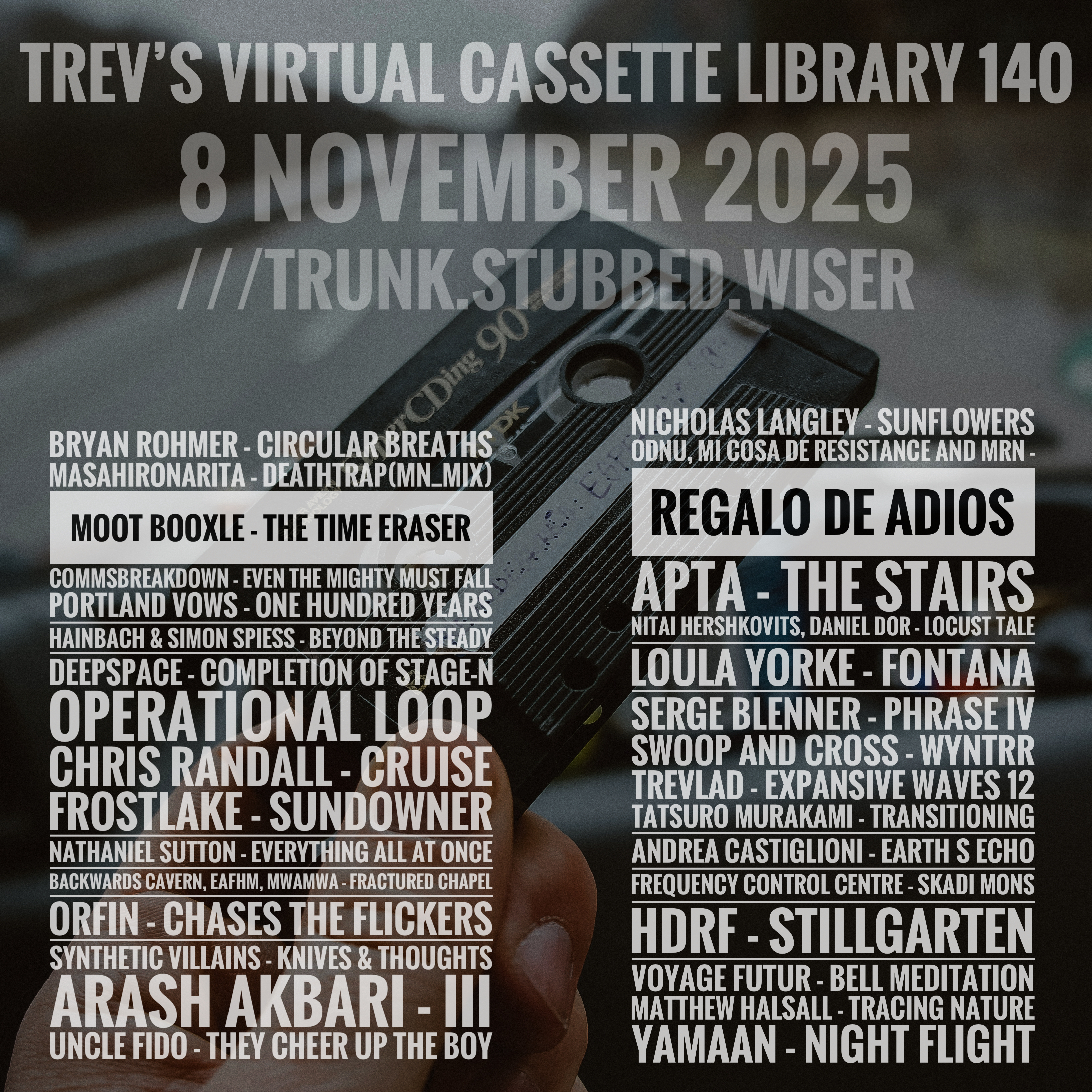 This entry was posted on November 8, 2025 by trevlad. It was filed under Mix shows, Music, Music podcast and was tagged with 100% Silk, Aberdeen, Alberta, ambient, ambient jazz, Ancona, Andrea Castiglioni, Apta, Arash Akbari, Argentina, Arizona, Arp, arp 2600, arpeggiator, Audiobulb, Audionautic Records, Australia, Austria, Backwards Cavern, Berlin, Binaural Space, breakbeat, breaks, Brighton, Bryan Rohmer, Bureau B, California, Canada, cheap synth music, chill out, chill-out, Chris Randall, comfy synth, comfywave, CommsBreakdown, compilation, Copenhagen, Daniel Dor, dark ambient, deep techno, deepspace, Denmark, DiN, Discus Music, down tempo, dreams, dreamscape, dreamwave, drone, drum and bass, Edmonton, electro acoustic, electro-boogie, electroacoustic, electronic, electronic music, electronica, em, England, eurorack modular, experiemental, experimental ambient, fidowave, folk, Frequency Control Centre, frostlake, Germany, Gondwana Records, Hainbach, halfstep, Hamburg, hauntological, hauntology, HDRF, Hobart, house, hypnagogic, hypnotic techno, I Low You Records, Illinois, instrumental, isolationism, Israel, Italy, Japan, jazz, joy, joygerms, kids music, kosmische, krautrock, Kremenchuk, Lancaster, Las Vegas, library music, lo-fi, Loula Yorke, Manchester, MasahiroNARITA, Matthew Halsall, meditation, Mexico, Mexico City, Mi Cosa de Resistance, modern classical, modular, modular synthesizer, Moolakii Club Audio Interface, Moot Booxle, mRn, Mystery Circles, Nathaniel Sutton, naturewave, Neotantra, Netherlands, Nevada, new age, New York, Nicholas Langley, nightmarescapes, Nitai Hershkovits, Not Not Fun Records, OdNu, Oregon, Orfin, Ormskirk, Owl Totem Recordings, Perceptual Tapes, Phoenix, Portland, Portland Vows, post new age, post-rock, progressive, Projekt Records, proto-electronica, psychedelic, radiophonic, radiophonic workshop, Raw Tapes, Richmond, science fiction, Secuencias Temporales, Serge Blenner, Sheffield, Simon Spiess, Sollentuna, Sounds for the Soul Records, soundscape, soundtracks, space music, spawave, spiritual jazz, Sunderland, Sweden, Swoop and Cross, synth, synthesizer, synthesizer music, Synthetic Villains, synthpop, Tatsuro Murakami, techno, techno and variations, Tel Aviv Yafo, Third Kind Records, Tokyo, toytronica, trevlad, Triplicate Records, UK, Ukraine, Uncle Fido, vaporwave, vaporwave ambient, Vienna, Voyage Futur, Whitelabrecs, Wirral, witch, woofwave, Yamaan.