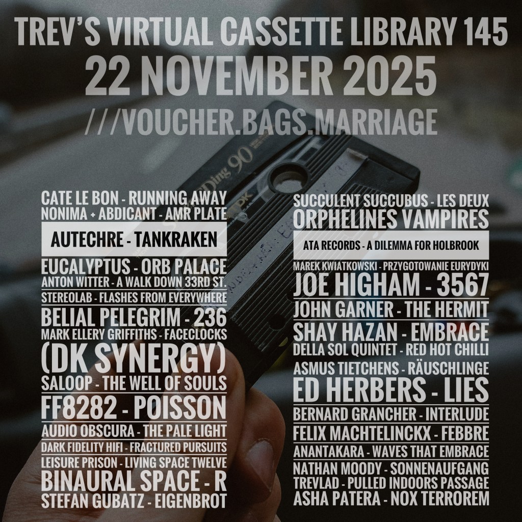 “Evening all. Episode one-four-five of the Virtual Cassette Library. Subtitled Voucher Bags Marriage. That’s the track you can hear underneath, and, oddly enough, it’s also a location you can find on a map. I filmed it—up on YouTube if you’re curious.”