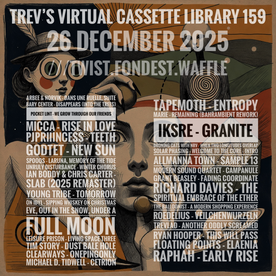 “Hello, I’m Trevor, and this is episode one‑five‑nine of the Virtual Cassette Library. Today’s theme is Twist Fondest Waffle—which, as usual, is both the track you’re hearing underneath and a location you can find on a map, if you’re the sort who enjoys chasing coordinates on What3Words. We’ve got ninety minutes ahead—two sides, fifteen tracks each. Some names you’ll know, some you won’t, and that’s half the fun. We begin with Arbee & Norvik drifting through a Montréal alleyway, Bary Center disappearing into the trees, and Pocket Lint reminding us that we grow through our friends. There’s a rise‑in‑love from micca, diamond‑cracking teeth from pjpriiincess, and a new sun courtesy of GODTET. Now then, starting back on episode 156, there’s a little cipher game running through the series. Each episode, during the intermission, you’ll hear a number. Scribble it down. After ten episodes, you’ll have the full sequence. Put the pieces together, crack the cipher, and you’ll unlock a code that knocks ninety‑five percent off anything on my Bandcamp page. Which means you can scoop up the whole discography for about two quid. It’s not meant to be difficult—just enough to keep you awake at night wondering if you’ll get it right. Later on, we’ll hear winter choruses from Unruly Disturbance, a 2025 remaster from Ian Boddy & Chris Carter, and a snowy Christmas‑Eve vignette from On Idyl. Leisure Prison gives us another living space, Tim Story offers a dust bale hole, and Clearways pings us exactly once before Michael D. Tidwell closes the A side. On the flip side, Tapemoth brings entropy, Marie dissolves into a Bahrambient remix, and IKSRE gives us granite from Imaginary North. There’s cartography from Droning Cats with NRV, Italian library breaks from Modern Sound Quartet, and a fading coordinate from Grant Beasley. Roedelius appears, as he often does, like a quiet blessing. I’ve slipped in one of my own—Another Oddly Screamed—before Floating Points and Raphah carry us gently to the end. It’s ambient, kosmische, wintery, slightly haunted, and occasionally festive in a sideways sort of way. The sort of thing you might stumble across late at night on a shortwave dial, wondering if you imagined it. So—headphones on, let time dissolve, and let the music claim you. First track up: Arbee & Norvik, Dans une ruelle, suite…”