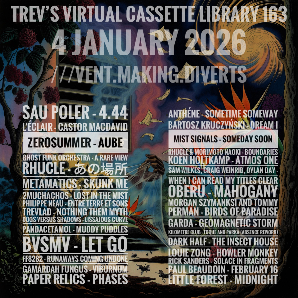 This entry was posted on January 4, 2026 by trevlad. It was filed under Mix shows, Music, Music podcast and was tagged with 2muchachos, 4000 Records, Absence, abstract ambient, ambient, analogue, anthéne, Atomnation, Australia, Balmat, Barcelona, Bartosz Kruczyński, Blackford Hill, Brighton, Brisbane, Brooklyn, Bulgaria, BVSMV, California, Colemine Records, Craig Weinrib, dance, Dark Half, deep funk, Dnipro, dogs versus shadows, downtempo, dreamwave, dreamy folk, Driftworks, drone, drone ambient, Dylan Day, город Череповец, Edinburgh, electro, electroacoustic, electronic, electronica, England, Estonia, exotica, experimental, experimental electronic, ff8282, field recordings, five, folktronica, Frankfurt, funk, Gamardah Fungus, Garda, Geneva, Germany, Ghost Funk Orchestra, hauntology, idm, Illinois, Imaginary North, Japan, jazz funk, jazz-funk, Kenosha, Kilometre Club, Koen Holtkamp, Lapsus Records, L’éclair, LEAVING RECORDS, leftfield, Les Disques Bongo Joe, Lithuania, little forest, lo-fi, Los Angeles, Louie Zong, lounge, Loveland, Mahorka, medidation music, medieval, meditation, melodic, Metamatics, Mexico, Milwaukee, minimal, Mist Signals, modern classical, modular synthesizers, Morgan Szymanksi, morimoto naoki, nature, Neotantra, Netherlands, new age, new romantic, New York, Nijmegen, Not Not Fun Records, Nottingham, Oberu, Ohio, Ontario, orchestral, Oxtail Recordings, Pandacetamol, Paper Relics, Paul Beaudoin, Philippe Neau, Poland, post-rock, psychedelic soul, quiet, radiophonics, retro, retrowave, Rhucle, Richmond, Rick Sanders, Russian Federation, Sam Wilkes, Sau Poler, Seil Records, sound art, soundscapes, soundtrack, space age, Spain, Stroud, Switzerland, Sydney, synthwave, Tallinn, techno, Third Kind Records, Tilburg, Tokyo, Tommy Perman, Toronto, trevlad, TRIP FM, Triplicate Records, Ukraine, Valle De Bravo, Vermont, Vilnius, Warsaw, Whitelabrecs, Wisconsin, zerosummer.