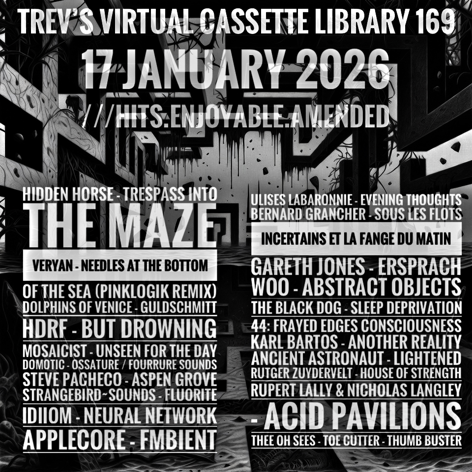 This entry was posted on January 17, 2026 by trevlad. It was filed under Mix shows, Music, Music podcast and was tagged with alternative, ambient electronic, ambient electronica, ambient music, ambient techno, ambinet, Ancient Astronaut, Antwerp, applecore, Argentina, Astra Solaria Recordings, Audiobulb, balearic, Belgium, Berlin, berlin school, Bernard Grancher, bizarre, Buenos Aires, Bulgaria, Buried Treasure, California, Cyclical Dreams, dark ambient, Dolphins of Venice, Domotic, dreamgaze, DRONARIVM, drone, drone ambient, dub, electro acoustic, electroacoustic, electronic, electronic ambient, electronic music, electronica, England, experimental, experimental electronic, field recordings, folktronica, Fonodroom, France, garage, Gareth Jones, Germany, glitch, Hamburg, hauntology, HDRF, Hidden Horse, idiiom, idm, instrumental, Italy, jazz, Karl Bartos, krautrock, Lisbon, lo-fi, London, Los Angeles, Mahorka, Minnesota, modern classical, modular synth, modular synthesizer, Mortality Tables, Mosaicist, Netherlands, New York, Ormskirk, Paris, Pinklogik, Portugal, psych punk, Rouen, Rupert Lally & Nicholas Langley, Rutger Zuydervelt, Scotland, Sheffield, Sollentuna, sound-art, soundscape, space music, St Paul, Steve Pacheco, Strangebird~Sounds, Sweden, synth pop, techno, The Black Dog, Thee Oh Sees, trevlad, UK, Ulises Labaronnie, Venice, Veryan, vintage synths, Whitelabrecs, Woo.
