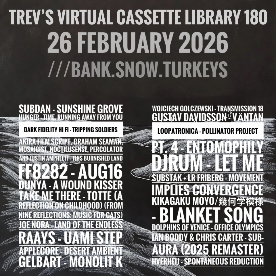 This entry was posted on February 26, 2026 by trevlad. It was filed under Music, Music podcast and was tagged with 4000 Records, Abbotsford, acid folk, Adventurous Music, Akira Film Script, alternative, ambient electronic, ambient techno, Amphlett, Amulet of Tears, applecore, Australia, bass, beats, Berlin, Bricolage, Brisbane, British Columbia, Bulgaria, California, chiptune, Chris Carter, Dark Fidelity Hi Fi, Data Airlines, DiN, Djrum, Dolphins of Venice, downtempo and chill, drone, dubstep, Dunya, electro, electro acoustic, electroacoustic, electronic, electronic music, electronica, em, experimental, experimental pop, experimental rock, ff8282, France, Friends Of Friends, Fukuoka, Gelbart, Germany, Glasgow, Graham Seaman, Greece, Guruguru Brain, Gustav Davidsson, Houndstooth, house, HUNGER, Hverheij, Ian Boddy, idm, Illinois, Italy, Αθήνα, Japan, Joe Nora, jungle, Justin, Kikagaku Moyo/幾何学模様, Kitchen Leg records, LEAVING RECORDS, Leipzig, Lithuania, Ljungskile, lofi, London, Loopatronica, Los Angeles, LR Friberg, Mahorka, Marseille, Marysville, modern classical, modular synth, Moolakii Club Audio Interface, Mosaicist, Mute, no wave, Noctilusense, noise, Nottingham, Passed Recordings, Percolator, Poland, psychedelic rock, r&b, raays, Remnants, retrowave, Richmond, rock, soul, sound art, soundtrack, SubDan, Substak, Sunderland, Sweden, synth, synthwave, Take Me There, techno, Tokyo, trip hop, Triplicate Records, UK, Uppsala, Venice, Vilnius, Washington, Weinstadt, weirdo, Whitelabrecs, Wirral, Wojciech Golczewski.