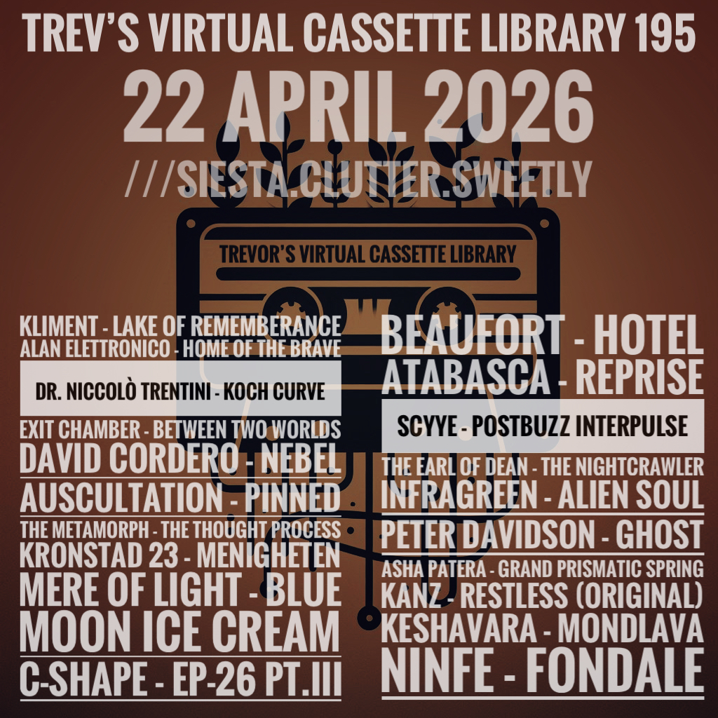 This entry was posted on April 22, 2026 by trevlad. It was filed under Mix shows, Music, Music podcast and was tagged with 100% Silk, Alan Elettronico, ambient, art, Asha Patera, Atabasca, Auscultation, Batov Records, Beaufort, Bergen, Berlin, Bulgaria, C-Shape, cinematic, Cologne, dark ambient, David Cordero, Dr. Niccolò Trentini, drone, Dustopian Frequencies, Edinburgh, electroacoustic, electronic, electronica, Exit Chamber, experimental, folk, funk, Germany, global funk, Groningen, Infragreen, Italy, jazz, Kaiseki Digital, Kanz, Keshavara, Killer Groove Records, Kliment, kraut pop, Kronstad 23, Lansing, Lighten Up Sounds, Liverpool, lo-fi, London, Mahorka, Mere of Light, Michigan, Milwaukee, Netherlands, new age, Ninfe, Noray Records, Norway, Oregon, Papercup Records, Passed Recordings, Peter Davidson, pop, Portland, post-rock, Projekt Records, psychedelic, psychedelic pop, Rome, Scyye, Sollentuna, soundscapes, soundtrack-music, space music, Spain, storytelling, Sweden, tapeloops, The Dream Journal Institute, The Earl of Dean, The Metamorph, UK, Uppsala, vaporscape, Wisconsin, world, world-music.