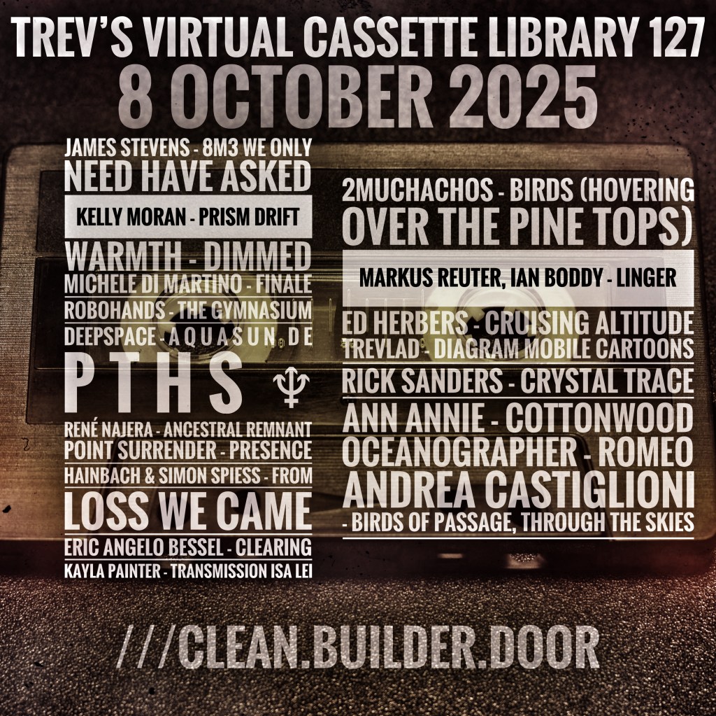 Welcome, sonic wanderers. You’ve arrived at the coordinates ///clean.builder.door—Episode 127 of The Virtual Cassette Library. A title, a signal, a portal. The track you’re hearing is available for pre-order on Bandcamp, already whispering through YouTube, it sets the tone for what’s to come. These mixes are 90-minute genre bending drifts through curated frequencies—designed for walking meditations, mental meanderings, and quiet communion with the cosmos. No commentary. No interruptions. Just pure sonic immersion. Styles include sci-fi, ambient, idm, new age, berlin school, hauntology, folktronica and more. The A side contains an exclusive track by Eric Angelo Bessel, titled Clearing, from the album, Mirror at Night, dropping October 31 on the Lore City Music label. The B side also contains one exclusive track by me and it’s titled Diagram Mobile Cartoons from my upcoming album TVCL 06. The track titles are also geographical locations where the videos for each track were captured. All available on the Trevlad Youtube channel. You’ve maybe noticed that I’m also releasing my first compilation for digital release. Which will be dropped on the 6th of November. Check out the socials if you want to get involved. 💌 Send your art to trevlad@gmail.com. Purchase paths are always illuminated at trevor.se and marked in each episode’s Mixcloud timeline. 🎶 Pre-order the 6th TVCL album on Bandcamp. It drops when we hit 16 tracks. Subscribe and unlock 854 archived shows. 🧙♂️ Shout out to Nanogod, whose alchemical words add dimension to the Mixcloud timeline. Every comment, every like, every vibration helps keep the channel alive. 🚀 So now—secure those headphones. Let time dissolve. Let the frequencies claim you.