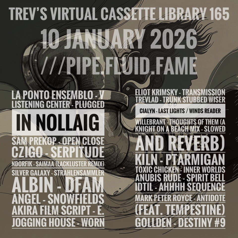 “Hello, Trevor here, and this is the all new Virtual Cassette Library and episode one‑six‑five. First up we have the La Ponto Ensemblo which is actually a duo made up of Hans-Dieter Schmidt and Edward-Clark Cornell who together make delicate and harsh neo-classical pieces. This is track five from their latest release Fragile Objects: In A Harsh Environment. Headphones on, let time dissolve, and let the music claim you. Next up an old favourite of mine in the form of fellow Irishman David K. Mason. Better known as Listening Center. Mason is now based in New York and runs the rather fantastic Temporary tapes label. Although this track, Plugged In Nollaig, (nollaig being Irish for Christmas) is from the Subexotic Records compilation EP Yule 25. Just a heads up, starting back on episode 156, there’s a little cipher game running through the series. Each episode, during the intermission, you’ll hear a number. Scribble it down. After ten episodes, you’ll have the full sequence. Put the pieces together, crack the cipher, and you’ll unlock a code that knocks ninety‑five percent off anything on my Bandcamp page. Which means you can scoop up the whole discography for about two quid. It’s not meant to be difficult—just enough to keep you awake at night wondering if you’ll get it right. Now next up the original sounds of Sam Prekop. Sam is a master of modular synthesis. This is the title track from his latest release Open Close which is available through Thrill Jockey Records. Now Mark Donlon also known as CZiGO with the dare I say jazz fusion injected piece, SERPITUDE, from his album, Techno Feudal. The latest to drop on New Zealand based Machine Records. Now Russian artist NDORFIK with the Idm vibe Saimaa which is named after a Finnish lake and here is given a Finnish remix by the legendary Lackluster. The album of the same name is available through the Local Gods label. Next up is from the i u we records label. A label focussing on the beauty of female diversity in electronic music. The artist is Silver Galaky and is a duo made up of Anna-Maria Van Reusel on modular and keyboard synthesizers, and usually a very imaginative guitarist Dennis Slypen. Although this piece might well be just anna letting loose on her 5U Moon Modular system. The track is Strahlensammler and is from the upcoming compilation release connected #3. Dropping on i u we records on the 20th of January. Now one of my favourite Swedish artists at the moment. Albin Johansson who simply goes by the name Albin. Everything Albin has released is gold. He has that retro library music ear which I cherish. This is the title track from the name your price EP DFAM which I believe is entirely written on the Moog Drummer From Another Mother. Albin is also a curator of the Malmö label Paltunes. Let’s go. And now staying in Sweden in a way. from my neighbours up the road Passed Recordings recent, must have Chrimbo compilation The Ghost of Christmas passed I’ve pulled another great track from the 35 piece strong release in the form of this short entry, Snowfields by the artist Angel who I no nothing about. Enjoy… Next up a long live piece I’ve kept its entirety for the episode. This is the artist Ryan Watts who goes by the wonderful name of Akira Film Script. Here with the piece E. Not to be confused with E or E.. Which are tracks on the same album titled Live at the Modern. It’s released on a label you should all know by now, whitelabrecs run by the unstoppable Harry Towell. And now to end the virtual A side another figure of the ambient scene who does more than his fair share, Boris Potschubay who we all know as Jogging House. Boris curates the fantastic label Seil Records on which he has released the album Kiosk. Here he is with the track Worn.