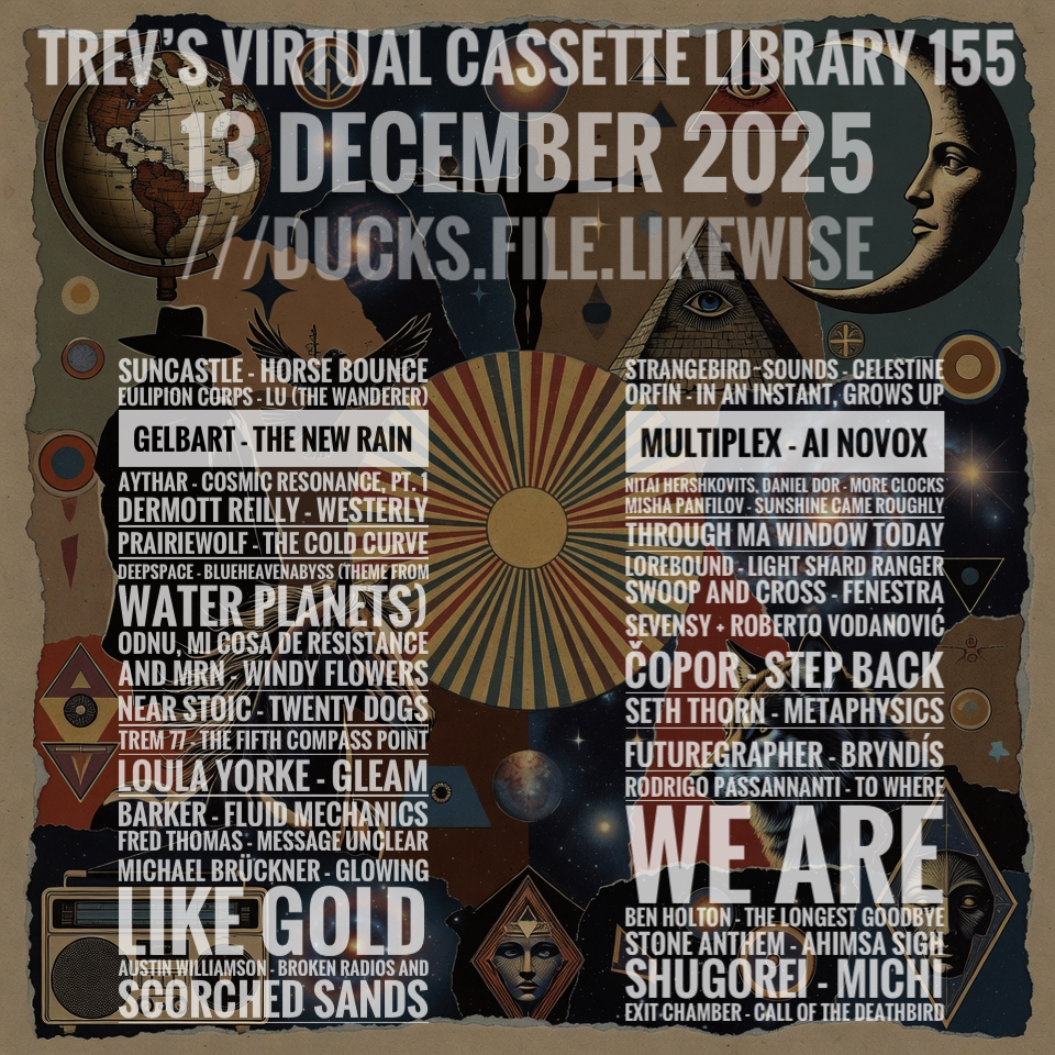 “Greetings all. Episode one-five-five of the Virtual Cassette Library. Subtitled Ducks File Likewise. That’s the track you hear underneath, and it’s also a location you can find on a map. I filmed it—it’s up on YouTube if you’re curious. I’m your host Trevor, presenting you with ninety minutes, two virtual sides, fifteen tracks each. You’ll hear Suncastle, Gelbart, Aythar, Prairiewolf, and deepspace. Loula Yorke, Barker, and Michael Brückner drift into kosmische and ambient zones, while Strangebird~Sounds, Orfin, and Multiplex carry us into the B side. Later, Rodrigo Passannanti, Ben Holton, and Shugorei appear alongside Stone Anthem and Exit Chamber. All woven into the resonance of the library. This episode also marks one year since the passing of Arni Gretar also known as Futuregrapher. His track Bryndís is included here as a tribute, a reminder of his spirit and the Icelandic currents he brought into electronic music. Labels orbiting here include Imaginary North, Projekt, Mahorka, Third Kind Records, and Cyclical Dreams. Styles range from ambient and drone to kosmische, experimental electronics, and hauntological textures. These transmissions stretch across places—Berlin, Toronto, Reykjavik, Brighton, and Buenos Aires. Thanks to everyone who joined us on the Listening party last night for the Resonances from the Depths compilation. What an amazing bunch you are. The eighth TVCL album is on Bandcamp for pre‑order—it drops when we hit sixteen tracks. Every comment, every like, every subscription keeps the frequencies flowing. So—headphones on, let time dissolve, and let the music claim you.