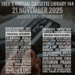 “Evening all. Episode one-four-four of the Virtual Cassette Library. Subtitled Decades Copying Observer. That’s the track you can hear underneath, and, oddly enough, it’s also a location you can find on a map. I filmed it—up on YouTube if you’re curious.” “I’m Trevor. Ninety minutes here, two sides, forty-five minutes each. Fifteen tracks per set. No chatter, no interruptions. Just the music, rolling on like a festival stage that turns—one act fading, another coming into view.” “Keys in focus this time: D sharp, E flat, and C minor. New friends joining us, Solar Phasing, Bary Center, and Futurum. familiar names returning, Floating Points, The Future Sound of London, The Twelve Hour Foundation, Ian Boddy and more. labels like Cyclical Dreams, Mahorka, Mortality Tables, Buried Treasure, Projekt Records, and Ingrown Records keeping the whole thing alive. They’re the soul of the show, really. There’s even an exclusive track from WHI Recordings from the album General Purpose Electronic Sound Vol.4 dropping December 5th.” “If you’d like to be part of these missions, send your work to trevlad@gmail.com. Track links are at trevor.se, and marked in the Mixcloud timeline. The eighth TVCL album is on Bandcamp for pre-order—it drops when we hit sixteen tracks. And the first compilation, Murmurs in the Mist, is out now, with forty-five artists involved.” “Every comment, every like, every subscription keeps the frequencies flowing. So—headphones on, let time dissolve, and let the music claim you.”