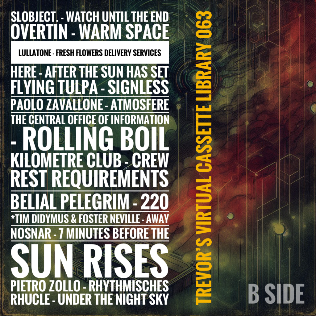 Trevor here, transmitting from home base Sollentuna, Sweden. This is your gateway to another immersive expedition through sound—Trevor’s Virtual Cassette Library 091 A 90-minute journey with a metaphysical flip at the halfway mark—perfect for a long walk, a mental wander, or a quiet moment alone with the universe. Today’s flight is sponsored by the labels that keep our circuits humming: Machine Records, Imaginary North, Mahorka, Cyclical Dreams, Mortality Tables, and, Waxing Crescent Records.