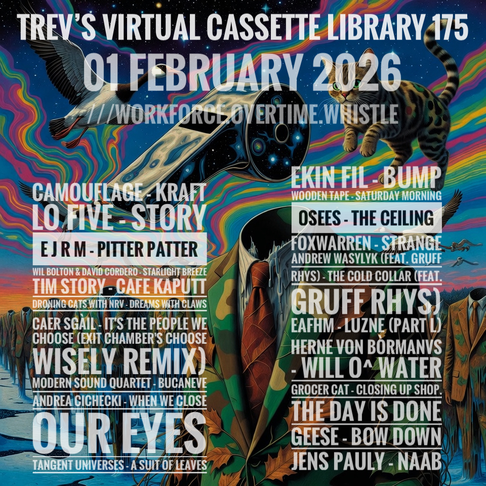 Good evening, or morning, or whatever sliver of the clock you’ve washed up in. This is Trev’s Virtual Cassette Library, episode one hundred and seventy-five. I’m Trevor, here again, turning over another worn cassette in the dim glow, letting the oxide whisper its secrets. These tapes arrive unmarked most times, or with labels half-peeled, but they carry traces—field recordings folded into drone, synths that drift like low cloud over northern latitudes, breaks that nod to libraries long since catalogued and forgotten, post-rock edges softened by reverb tails, psych undercurrents that never quite surface, ambient excursions that refuse to resolve. Scotland lingers in a few of these grooves, Cologne breathes through one, Italy scatters light across another, while others seem to come from no fixed place at all, just coordinates lost between sleep and map. No rush tonight. Twenty pieces, two sides, a flip when the spool runs thin. If the kettle needs boiling, let it. If the room grows cold, pull something closer. The world can wait outside the door. It’s a special Saturday here in Sweden and marks the start of the Melody Festival. Which, however you feel about it makes the long winter up here bearable. How ever you feel about the music represented. Now back to this outing. First, something that moves like light through leaves in late winter. Camouflage by Kraft, from the Bureau B 2025 release on Bureau B. A gentle, sensual, unfurling, synths breathing slow. Headphones on, let time dissolve and let the frequencies claim you. Camouflage – Kraft. Now Lo Five with STORY, pulled from Superdank on Lunar Module. A definite nod to the ORB, A pumping beat over child spoken narrative and House stabs. STORY – Lo Five. Now taking us way down. E J R M offers Pitter Patter, part of Solar Return – Gollden Hour Mix on Imaginary North. Glistening drones that patter like rain on tin, layered with distant chords. Pitter Patter – E J R M. Now staying in Droneville. Wil Bolton and David Cordero together for Starlight Breeze, from How to Make Sense of Downtime on the Home Normal label. Notes drift against soft drones, a breeze indeed. Starlight Breeze – Wil Bolton & David Cordero. Now a shot one, 1:25 to be exact. Tim Story and Cafe Kaputt, taken from Buzzle on Curious Music. Melancholic Mellotron keys and a Hugh Hopper style bass, in a room that’s emptying slowly. Cafe Kaputt – Tim Story. The longest piece for the episode at 8 minutes. Droning Cats with NRV bring Dreams with Claws, from Cartography of Sleep on Barcelona based See Blue Audio. Claws sheathed in haze, dreams that scratch gently. Bobbling bass which sounds like it’s being played by the tide. and sparse porch friendly guitar lines. Dreams with Claws – Droning Cats with NRV. Caer Sgàil, from Scotland, with It’s The People We Choose (Exit Chamber’s Choose Wisely Remix), off It’s The Remixes We Choose EP on Caer Sgàil’s Bandcamp. Deep, shadowed rework, piano buried in mist. It’s The People We Choose (Exit Chamber’s Choose Wisely Remix) – Caer Sgàil. And now for something completely different. Modern Sound Quartet and Bucaneve, from Italian Library Breaks on Four Flies Records. Breaks with a Mediterranean lightness, snow in name only. Italian library jazz fusion from the 70s. Bucaneve – Modern Sound Quartet. Another longer track at 7:39. Andrea Cichecki offers When We Close Our Eyes, shared with track that follows by Tangent Universes on Connected 3 via I u we Records. Eyes closed, the world turns inward, synths cradle the shift. When We Close Our Eyes – Andrea Cichecki. And right beside it, Tangent Universes with A Suit Of Leaves, also from Connected 3 on I u we Records. Leaves rustling in some parallel season. A Suit Of Leaves – Tangent Universes. Time to turn the tape. Listen for the clunk, the hiss, the moment the mechanism catches.
